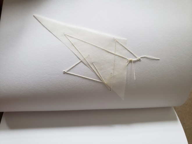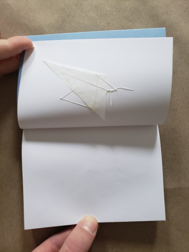 4 x 6 in, 16 pages. Thread (various colors), paper, various materials and typewritten text on paper. French flaps, stab binding.