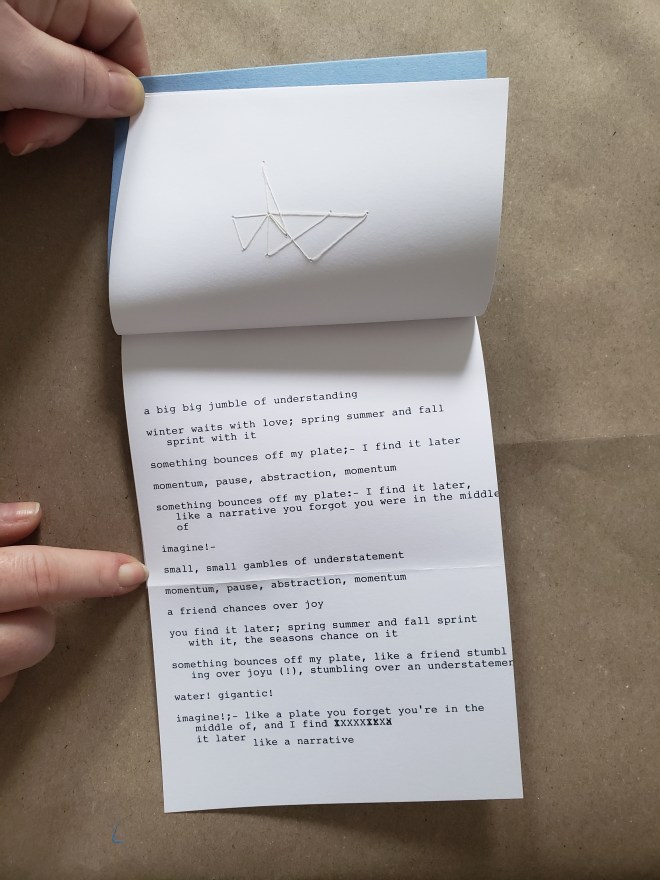 yesterday’s jam is a collaborative work of text and sewing. Hand sewn thread and material designs are interspersed with foldout pages of typewritten texts. The book is a conceptual relative to pre/post/during (2024).