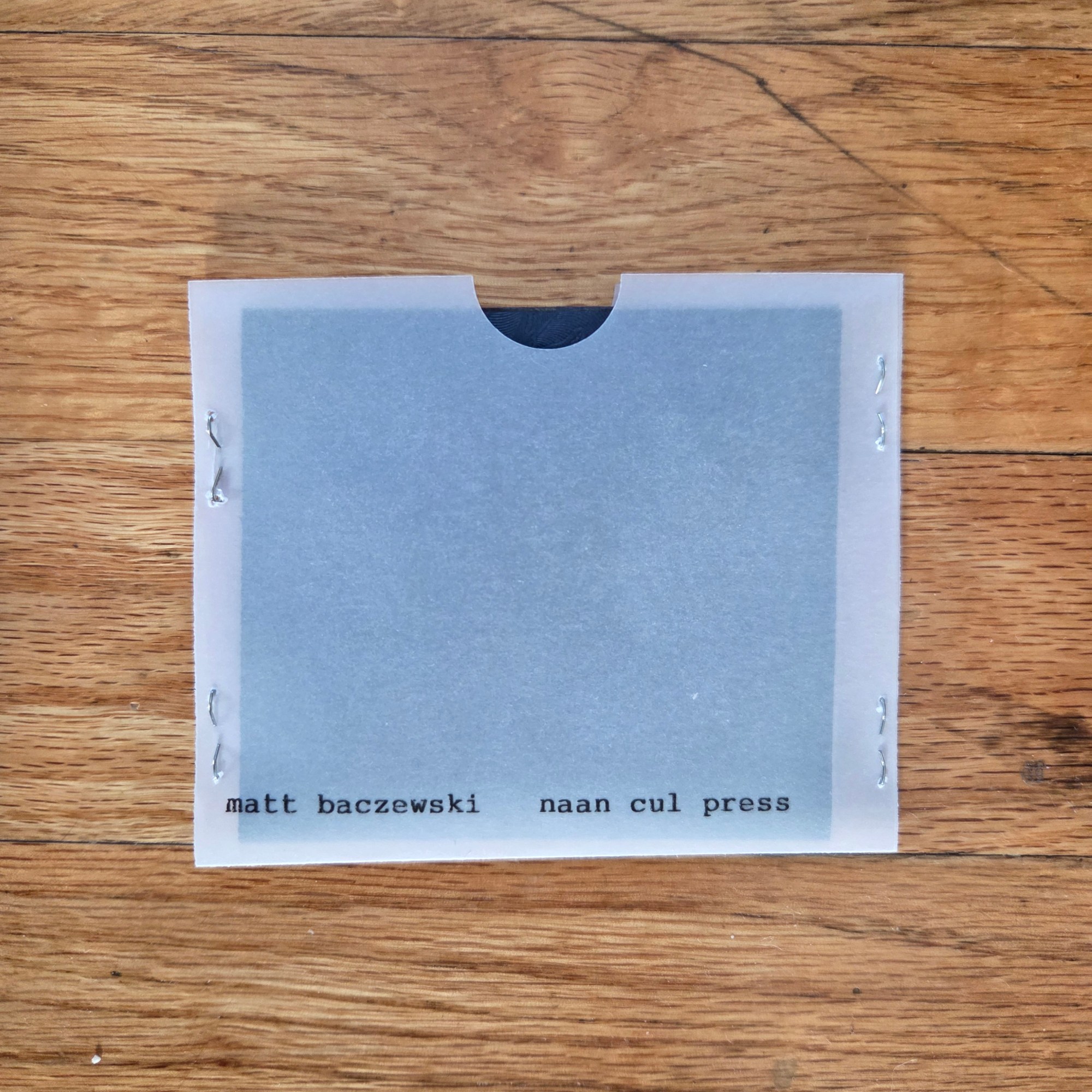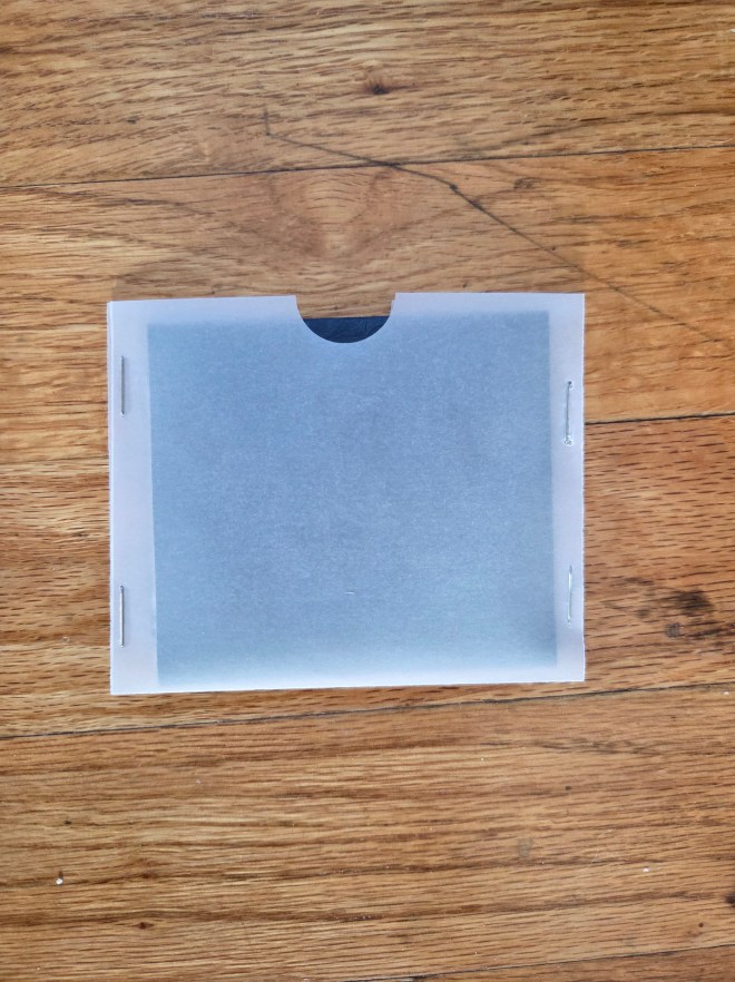 3.75″ x 3.125″, stapled translucent paper pocket, embossed paper sleeve, circular text sheet