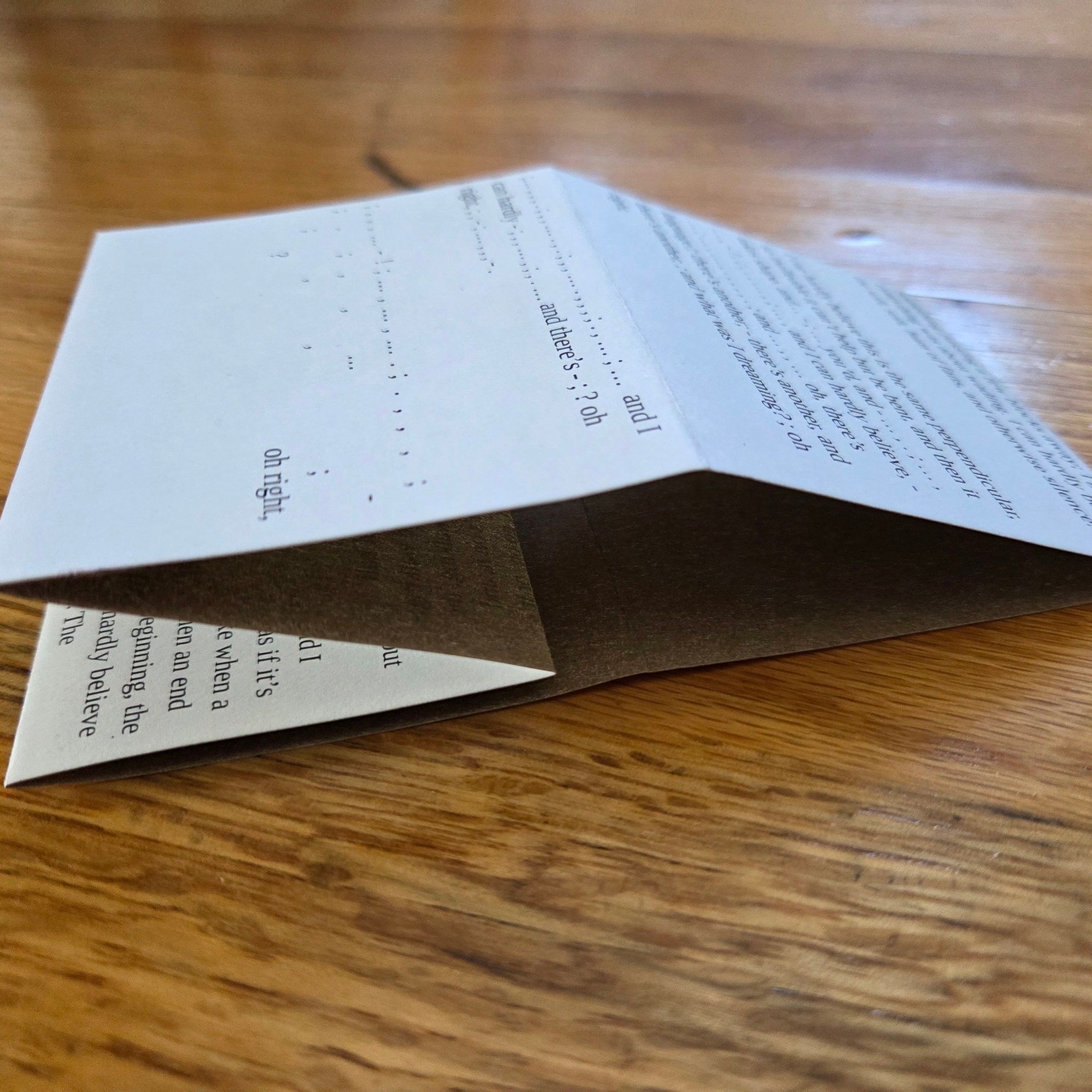 The text is printed on the reverse of gold ink-flooded risograph cleaner sheets, encased in a sleeve embossed with a leaf pattern, then housed in a translucent pocket.